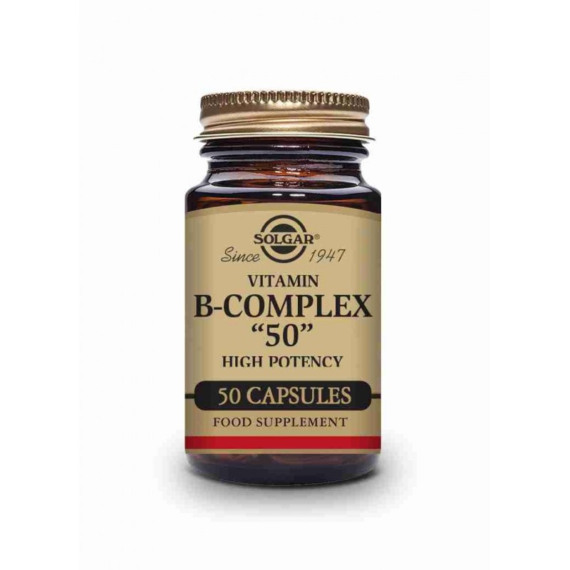 Solgar® Vitamina B-Complex ''50'' es un complejo de vitamina B de alta potencia que aporta una dosis de 50 mg de las principales vitaminas del grupo B. Muchas vitaminas del grupo B son interdependientes y por eso es mejor tomarlas combinadas, por ejemplo en un complejo de vitamina B o un producto multivitamínico que contenga un complejo de vitamina B.