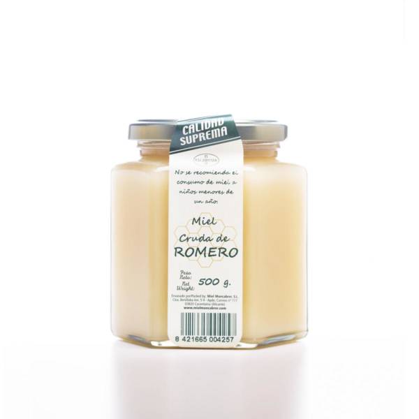 MIEL CRUDA DE ROMERO: es una miel de color muy claro, llegando al blanco en el caso de las mieles crudas. Su delicado aroma floral con cierto componente alcanforado, la convierte en una miel de gusto dulce con ligeras notas ácidas. Es adecuada para multitud de recetas culinarias, especialmente para aderezar un buen pescado blanco al horno, o bien para endulzar nuestras infusiones o bebidas refrescantes.