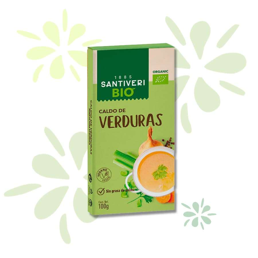 Caldo Vegetal de Santiveri se trata de un preparado a base de hortalizas deshidratadas (cebolla, poro, zanahoria, tomate, col, perejil). Se utiliza para elaborar consomés vegetales, sopas de verdura, así como saborizante de diversos platos culinarios (guisados, purés, pastas, paellas, verduras, salsas).