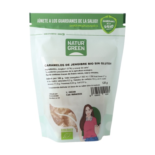 Los caramelos ecológicos de jengibre de NaturGreen están elaborados con jengibre y azúcar de caña procedentes de la agricultura ecológica. Son ideales para consumir entre horas, o para aliviar molestias de garganta. Su sabor picante y aromático aporta frescor a tu boca. Los amantes del jengibre no podrán evitar llevar estos caramelos siempre a mano.