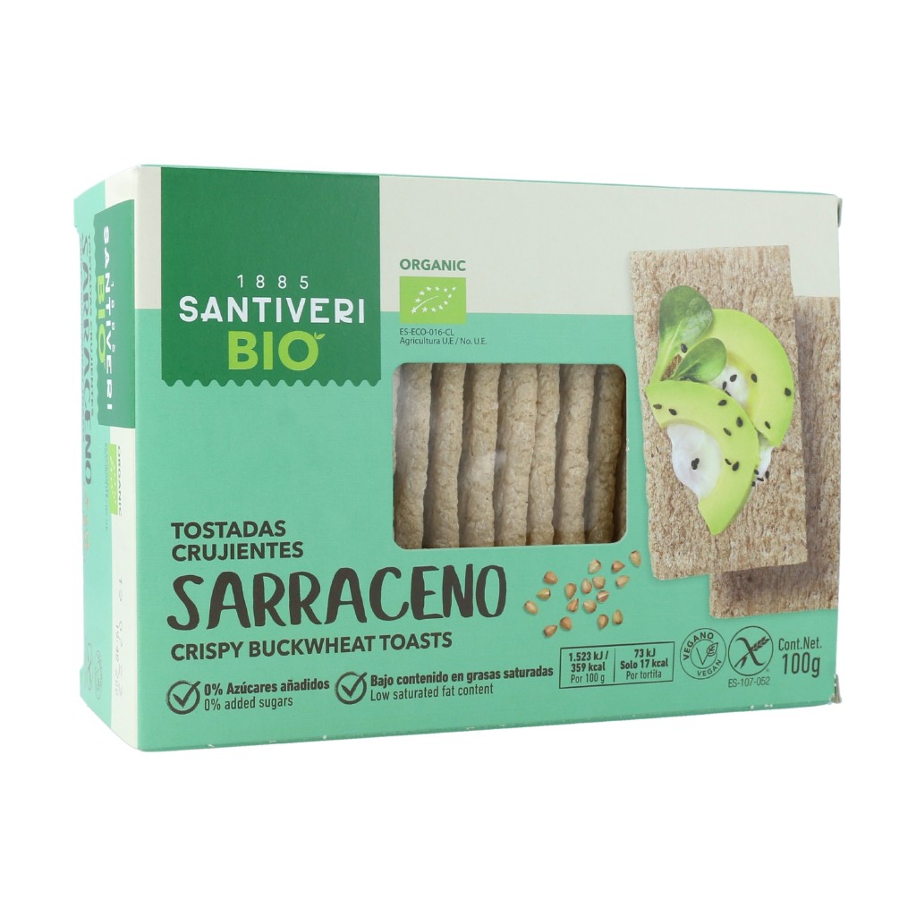 Tostadas de Trigo Sarraceno Bio de Santiveri es un producto crujientes con ingredientes 100% vegetales y bajo en grasas saturadas. Es ideal para reemplazar el pan en la comida, para el desayuno, snack o aperitivos. También pueden utilizarse en la elaboración de canapés o como tentempié a media mañana o a media tarde.