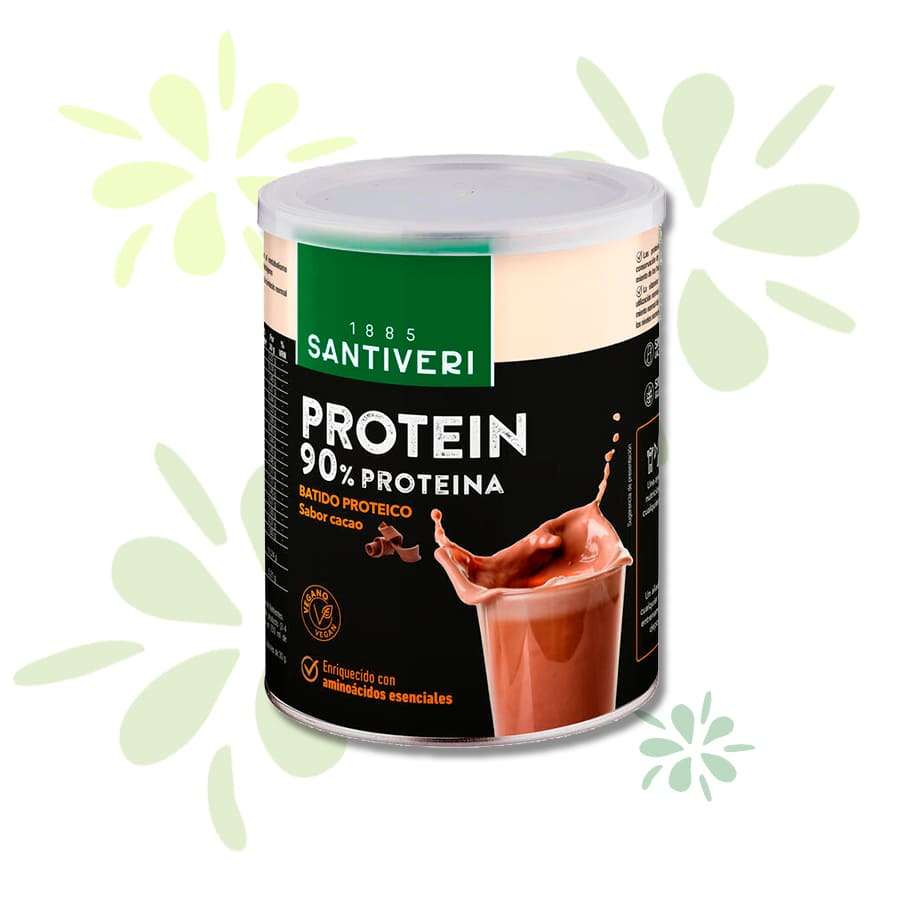 Protein 90 con sabor a cacao de Santiveri es un preparado alimenticio con alto contenido en  proteínas (90%) y enriquecido con aminoácidos esenciales y vitaminas.