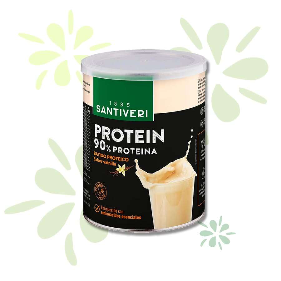 Protein 90 con sabor a vainilla de Santiveri  es un preparado alimenticio con alto contenido en  proteínas (90%) y enriquecido con aminoácidos esenciales y vitaminas.