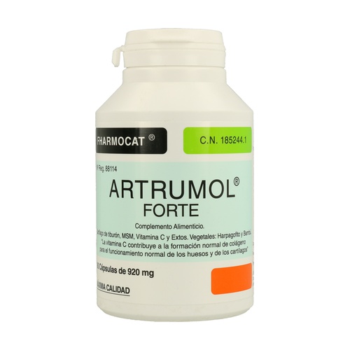 Artrumol Forte de Fharmocat es un complemento alimenticio a base de cartílago de tiburón, minerales (calcio, hierro, magnesio, etc.), vitamína C, y harpagofito, que ha sido creado para ayudar a aliviar los dolores articulares, de cartílago y huesos en general.