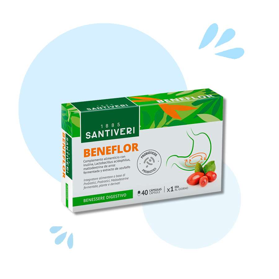 Beneflor de Santiveri es un complemento alimenticio con prebióticos, probióticos, y enzimas digestivas que protege el estómago, facilita la digestión y el tránsito intestinal.