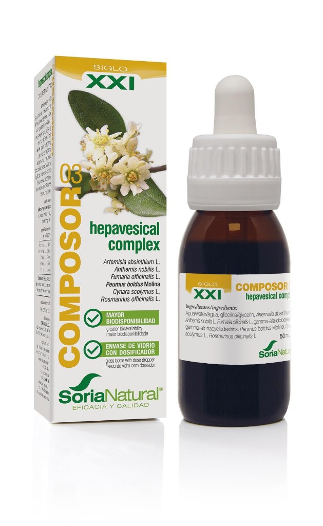 Composor 3 Hepavesical Complex es una mezcla de ajenjo, manzanilla amarga, fumaria, boldo, alcachofera y romero, que mejora la función del higado y la digestión.