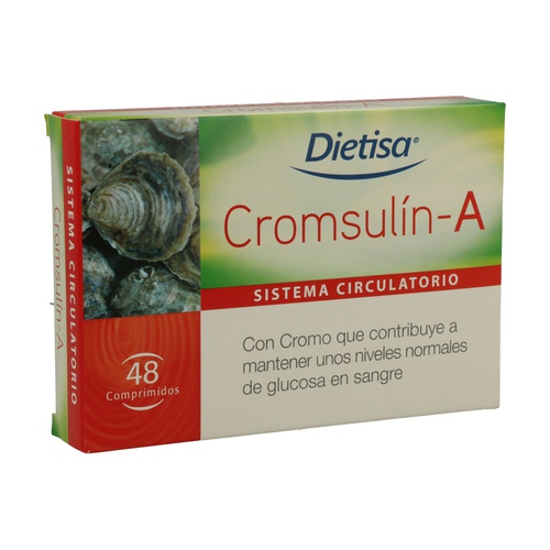 Cromsulín-A de Dietisa es un complemento alimenticio a base de extracto de ostra, cromo, magnesio y vitaminas A y del grupo B. Cromsulín-A contribuye a mantener unos niveles normales de glucosa en sangre.