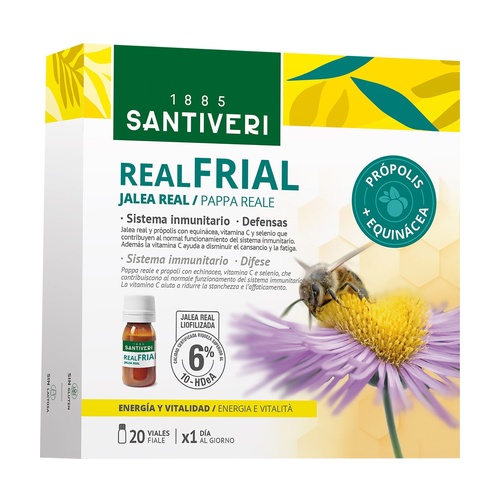RealFrial Santiveri es un complemento alimenticio elaborado a base de jalea real, jugo de equinácea, propóleo, vitamina C y selenio. La jalea real en un ingrediente altamente nutritivo, ideal para complementar la dieta y promover el bienestar. La jalea real utilizada en RealFrial Santiveri es jalea real liofilizada, 3 veces más concentrada que la jalea real fresca. La calidad de la jalea real se valora según su contenido en ácido hidroxidecenoico (10-HDeA), un componente que es exclusivo de la jalea real. El valor necesario para garantizar un contenido óptimo de nutrientes y principios activos debe ser superior al 6%. Santiveri garantiza esta concentración en todas sus jaleas para ofrecer productos de calidad máxima.
