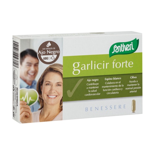 Garlicir de Santiveri es un complemento alimenticio a base de extractos de ajo negro, olivo y espino blanco, que nos ayuda a mantener la presión arterial normal. Ideal para personas de edad avanzada que deseen mantener una buena circulación sanguínea, personas con tensión alta o que deseen mantener un buen nivel de tensión arterial.