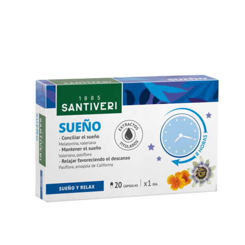 Sueño – Santiveri es un complemento alimenticio a base de melatonina y extractos titulados de grifonia, amapola de california, pasiflora y valeriana.